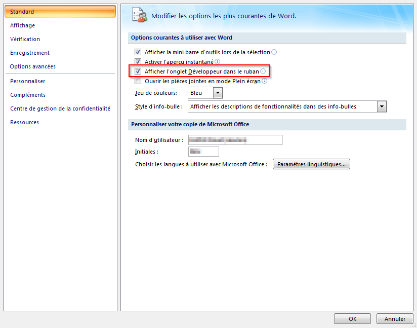 Afficher le ruban développeur si nécessaire. (Menu office > Option word > cocher Afficher le ruban développeur)