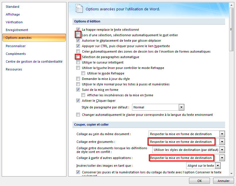 - Décocher la sélection auto des mots entiers et des paragraphes