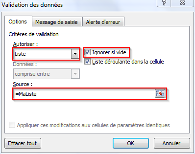 Validation des donnéesdans le rubanDonnéeset remplir les champs suivants :
