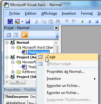 Ouvrir l'éditeur vba (depuis l'onglet développeur) puis sélectionner le nœud racine de Word.