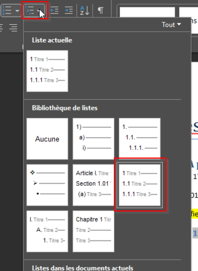 Écrire un titre et lui appliquer le style titre (normal), puis dans le ruban Accueil, groupe Paragraphe, Icône Liste à plusieurs niveaux, Section Bibliothèque de listes, sélectionner une des numérotations de titre.
